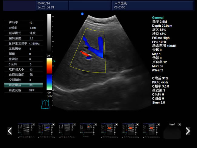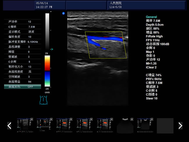 彩色血流圖像調節參數:多普勒頻率、取樣框位置和大小、基線、彩色增益、偏轉角度、壁濾波、累積次數等。