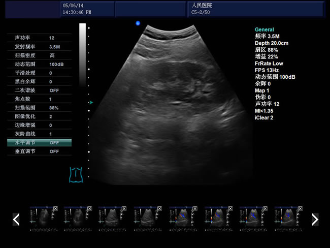 頻率、幀頻、B模式總增益、C模式總增益、D模式總增益、菜單、注釋、灰階帶、穿刺引導線、PRF、壁濾波、血流相關、累積次數、TI熱指數、MI機械指數
