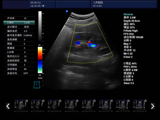 彩色血流圖像調節參數:多普勒頻率、取樣框位置和大小、基線、彩色增益、偏轉角度、壁濾波、累積次數等。